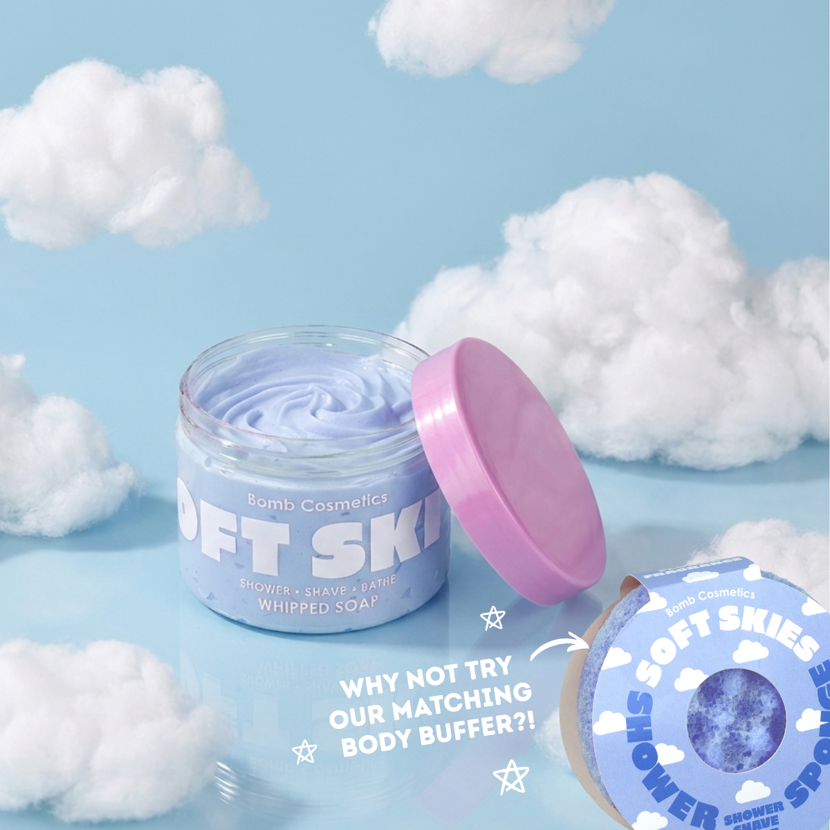 Soft Skies is a luxuriously whipped soap that feels like a gentle escape into calm. Hand-piped and crafted with a rich, skin-loving butter base, it creates a creamy, cloud-like lather that cleanses while leaving skin soft, smooth, and comforted.